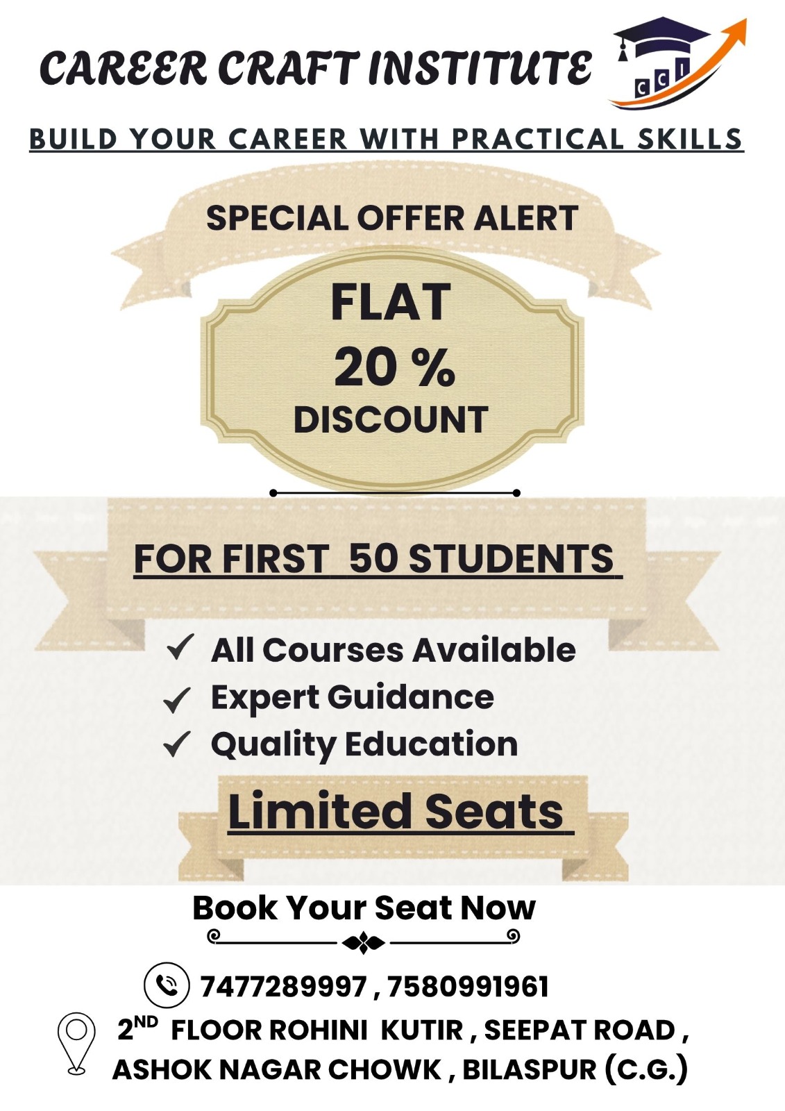 EXCELLENT Based on 17 reviews Posted on AVINASH SHARMATrustindex verifies that the original source of the review is Google. “Impressed by the focus on real-world skills, small batch attention, and courses like Tally + GST, AI tools, and digital marketing. The added benefits like interview preparation and career guidance make it a complete package for anyone serious about upskilling and getting job-ready.”Posted on SUPRIYA VERMATrustindex verifies that the original source of the review is Google. Beginning of Brightful Future !! With carreer craft . Mentorship with highly experienced persons . Make ur journey to excellence . So start with this institute This is the place where u learn advance learning skills.Posted on CMA ALOKESH DUTTATrustindex verifies that the original source of the review is Google. At Bilaspur no institute or coaching center offers such type of job ready courses. They have experienced faculties and excellent classroom and Computer Lab which differentiates them from others. They also offer internship and placement assistance. The institute is run by industry specialist CA CMA CS which added value to teaching experiencePosted on AKSHAT SHARMATrustindex verifies that the original source of the review is Google. From Tally & GST to AI tools and digital marketing, the course portfolio is modern, relevant, and designed for today’s competitive world.Posted on SATPRIYA MOHLETrustindex verifies that the original source of the review is Google. “This institute is very helpful for students’ future. The teachers are experienced and explain every topic in a simple way. The study environment is disciplined and motivating.”Posted on RAVINDRA P. SINGHTrustindex verifies that the original source of the review is Google. Craftage Career Institute’s Accounting section is seriously top-notch! Super practical training, crystal-clear concepts, and real-world skills—hands down one of the best out there. Kudos to the entire team! 👏 #Craftage #AccountingExcellence”Verified by TrustindexTrustindex verified badge is the Universal Symbol of Trust. Only the greatest companies can get the verified badge who has a review score above 4.5, based on customer reviews over the past 12 months. Read more